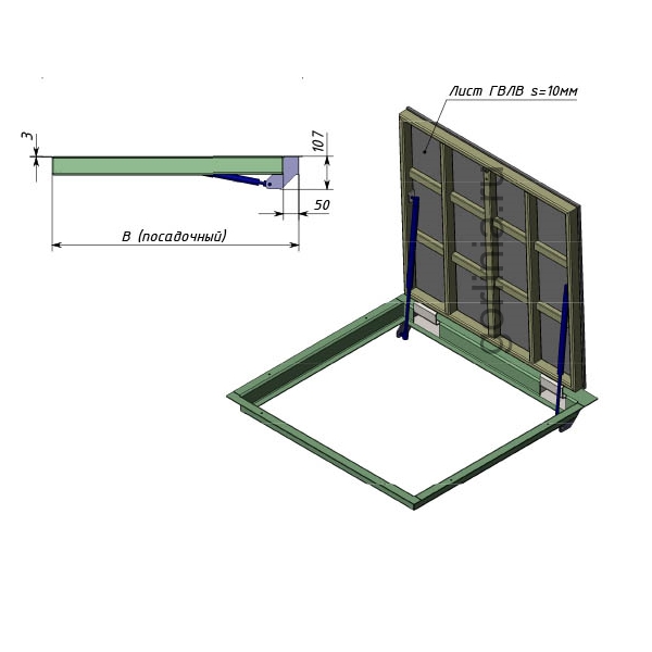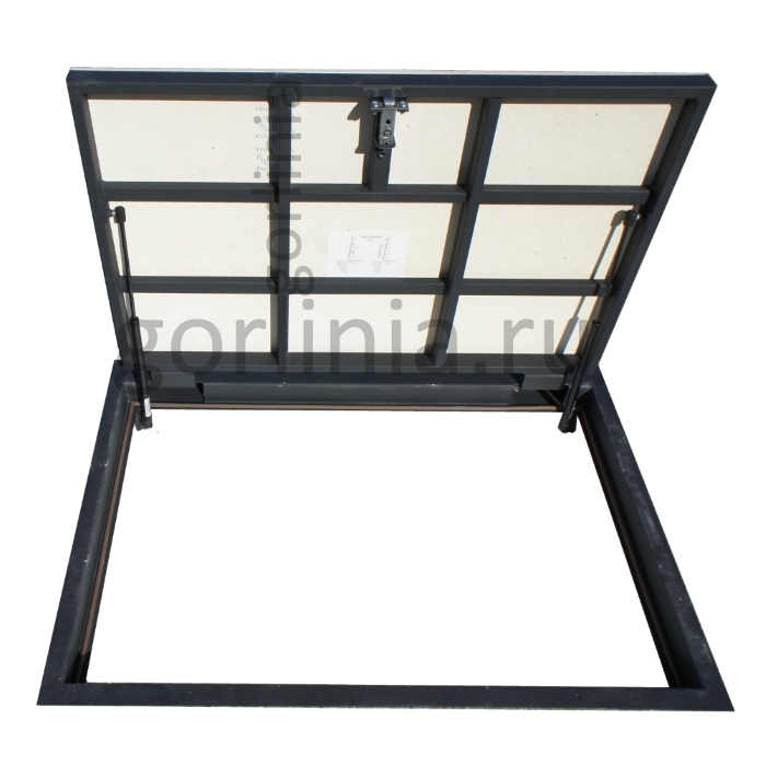 Облегченная коробка из профилированного листового проката 3 мм с наличником 35 мм (10 со стороны открывания) - есть требования по установке, предварительная консультация обязательна! Каркас дверки с обвязкой сварен из трубы 30х20, заполнен ГВЛ под чистовую отделку. Конструкция смещенного за ось шарнирного соединения сохраняет лаза в чистоте 1150х600 для удобства спуска по лестнице в подвал.